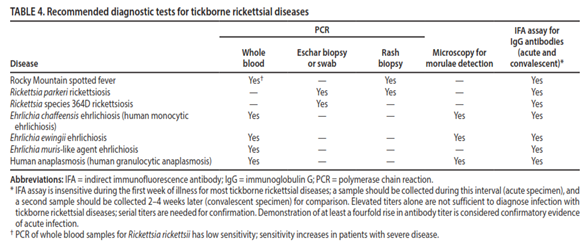2401.170979 - CDC. Clinical and Laboratory Diagnosis for Rocky Mountain Spotted Fever. Updated May 15, 2024. https://www.cdc.gov/rocky-mountain-spotted-fever/hcp/diagnosis-testing/